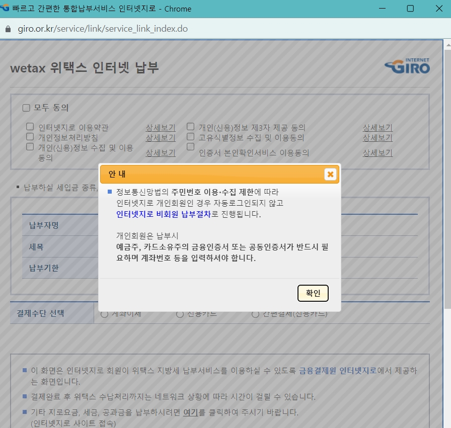 해당 세금을 내겠다고 클릭하면 회원납부와 타인납부 중 선택하라고 나오는데, 본인이 각자의 세금을 내는 것이니 회원납부로 하겠습니다.